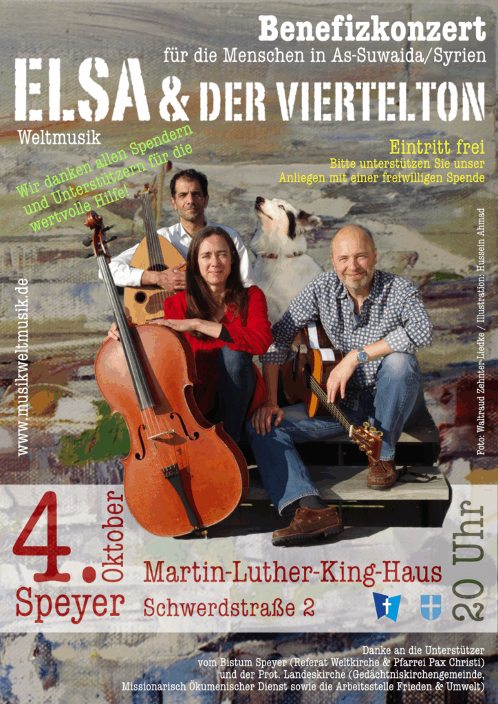 Mit ihrem Benefizkonzert bittet die Gruppe „Elsa und der Viertelton“ um Solidarität mit den Menschen in Suwaida. Sie stehen auf der Bühne um durch ihre Musik von Schmerz und Hoffnung zu erzählen – und um Herzen zu berühren. Die Klänge sollen Brücken schlagen und Mut machen in einer Zeit in der die Zukunft ungewiss ist.